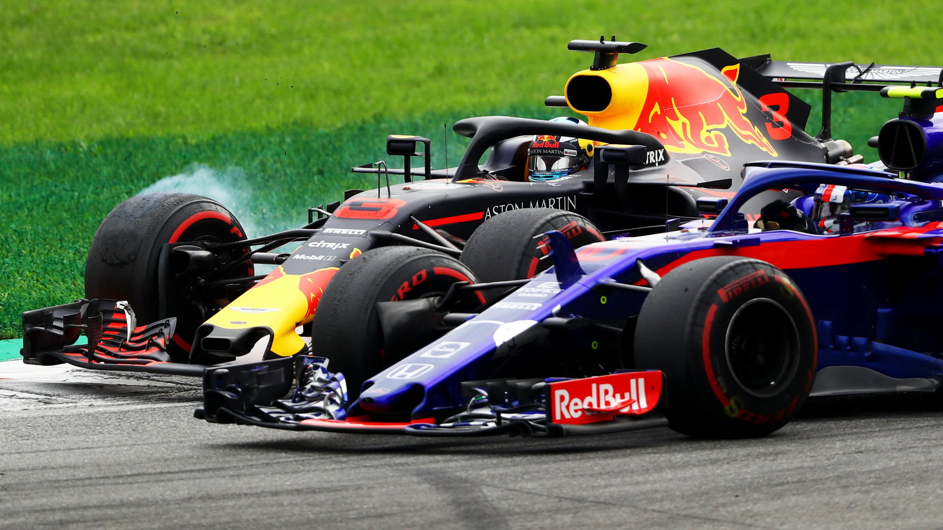 Daniel Ricciardo při předjíždění Pierra Gaslyho v závodě v Monze
