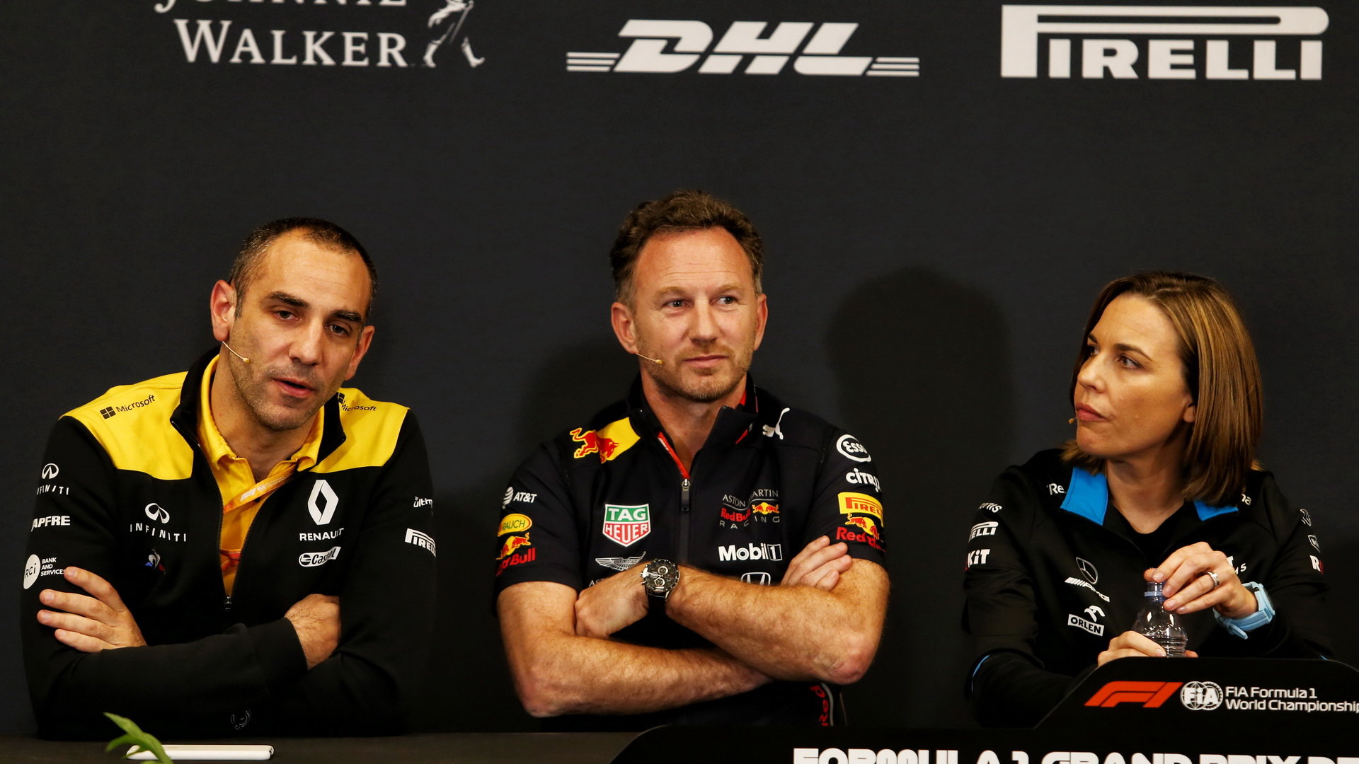 Cyril Abiteboul, Christian Horner a Claire Williamsová na tiskovce v Monaku